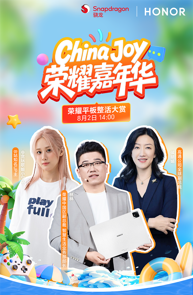 在8月1日开幕的第二十二届中国国际数码互动娱乐展览会(ChinaJoy)上,荣耀在N5馆亮相,以夏日乐园为主题,打造为期4天的娱乐游戏体验展,吸引了现场观众纷纷驻足游玩。8月2日,高通全球副总裁侯明娟与荣耀中国区副总裁林林现身荣耀官方直播间,以新奇有趣的方式,现场体验了荣耀GT Pro、荣耀平板GT2 Pro等多款旗舰新品,吸引了众多线上观众直播间“云逛展”交流互动。