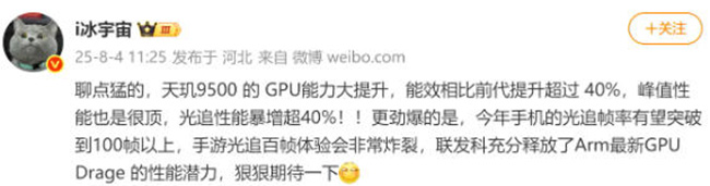 性能封神?i 冰宇宙给答案:天玑 9500 把 GPU 能效拉高 40%,光追性能同样翻倍狂飙!这是在用实力教友商重新做人!