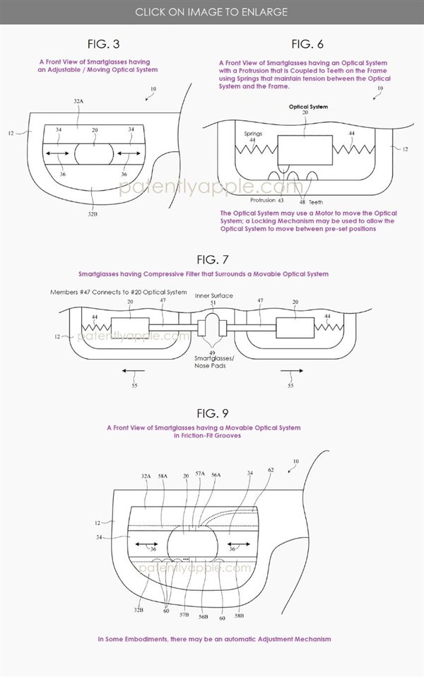 与苹果此前相关专利不同,该系统与机载传感器协同,实时获取用户瞳孔位置及面部数据,经算法计算后自动完成多参数光学校准,无需传统处方眼镜或手动调节。