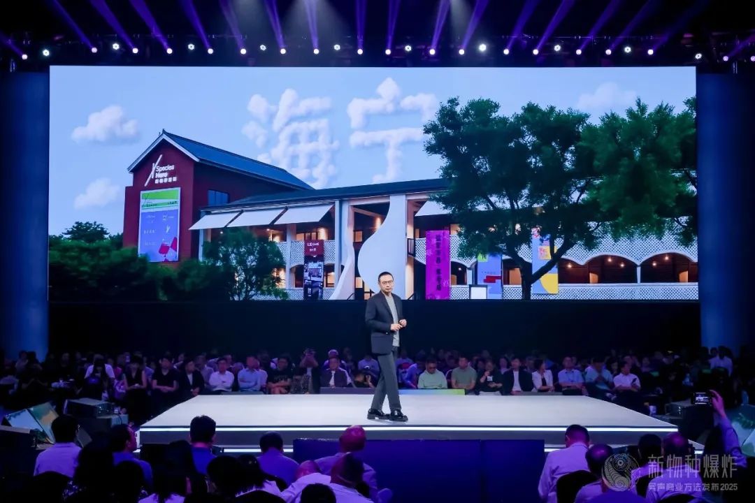 现在我们身处79罐,新物种爆炸大会连续9年都在这里举办。而「新物种」又是如何完成超越现场的叙事,我想分享过去一年,场景实验室完成的一个有意义的项目,与海宁文旅,在志摩故里所在的干河街,共同打造的「新物种空间XSpecies Here」。Here也是我们的空间方法,一个遵循「生长模式」而非「生产模式」的文化消费综合体。生长,是扎根土壤,更要融入生态,所以我们定义它是一个根植在地、开放连接的文化消费综合体。