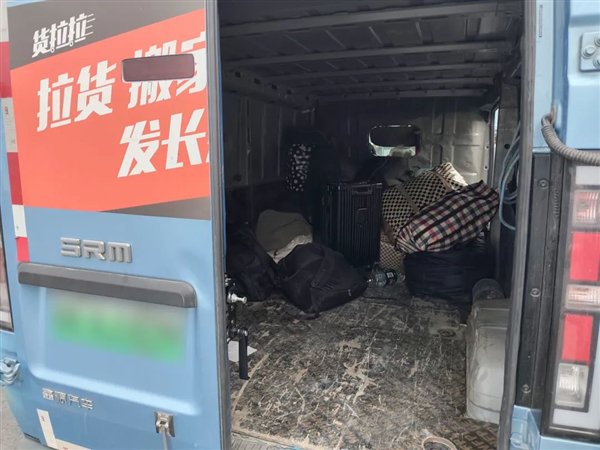 原来在不足几平米、没有任何安全设施的黑暗货箱内,竟然密密麻麻蹲坐着、蜷缩着整整9名成年乘客,随车还有他们携带的各种行李物品。