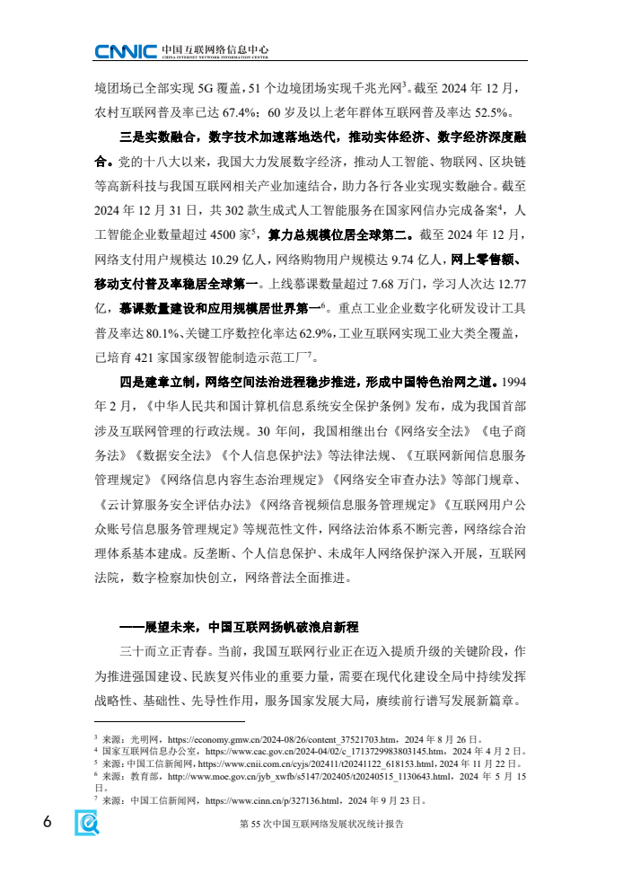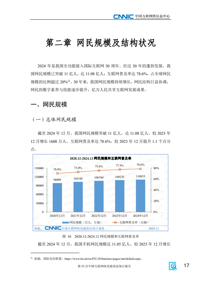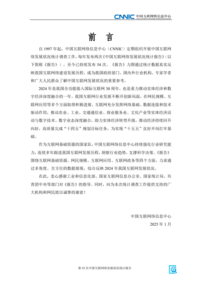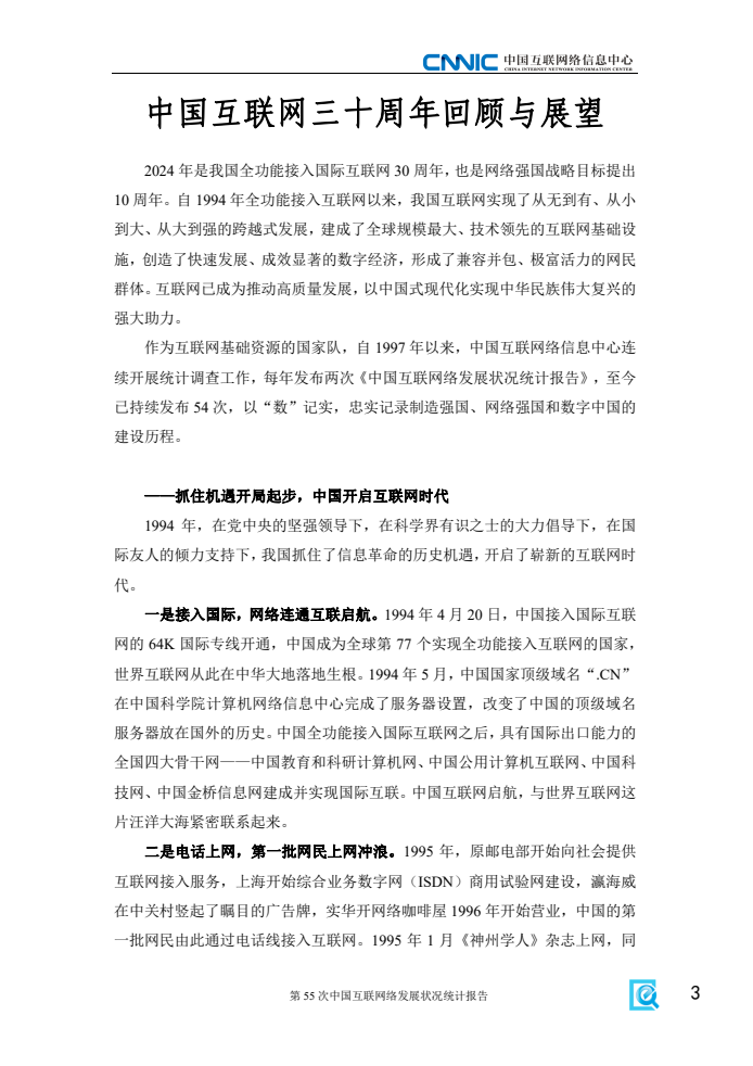 《报告》显示,2024年是我国全功能接入国际互联网30周年。30年间,我国互联网实现了从无到有、从小到大、从大到强的跨越式发展,建成了全球规模最大、技术领先的互联网基础设施,构建起全球最大的网络零售市场和网民群体。网民规模从1997年的62万人增长至2024年的11.08亿人,互联网普及率升至78.6%。互联网已成为推动高质量发展,以中国式现代化实现中华民族伟大复兴的强大助力。