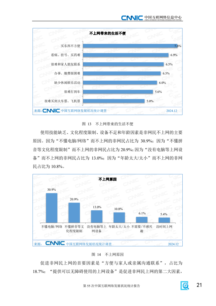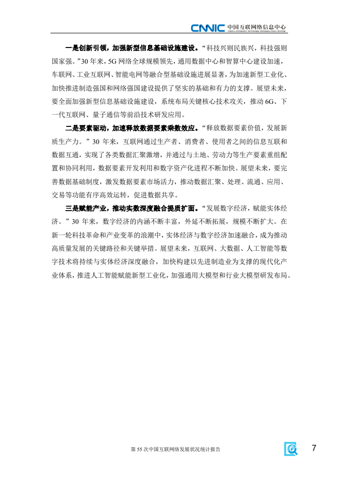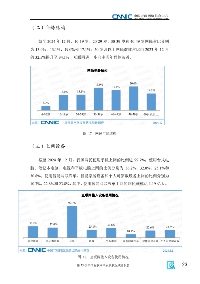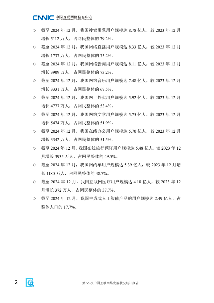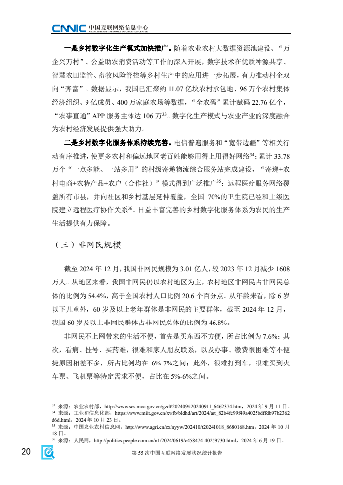 《报告》显示,2024年电信普遍服务和“宽带边疆”等相关行动有序推进,让更多农村和偏远地区老百姓用得上、用得好网络。一是乡村数字化服务体系持续完善。截至12月,我国农村网民规模达3.13亿人,占网民整体的28.2%。村级寄递物流综合服务站累计建设33.78万个,“寄递+农村电商+农特产品+农户(合作社)”模式广泛推广;远程医疗服务网络覆盖所有市县,并向社区和乡村基层延伸覆盖,为乡民的生产生活提供了有力保障。二是乡村数字化生产模式加快推广。数字技术在优质种源共享、智慧农田监管、畜牧风险管控等乡村生产中的应用进一步拓展,“全农码”累计赋码22.76亿个,“农事直通”APP服务主体达106万,数字化生产模式与农业产业的深度融合为农村经济发展提供强大助力。