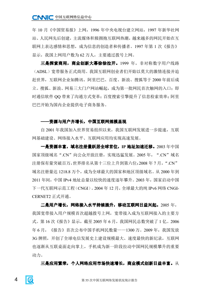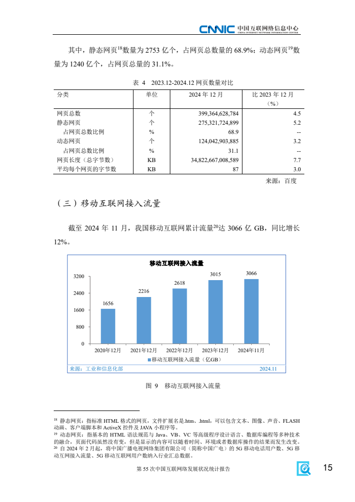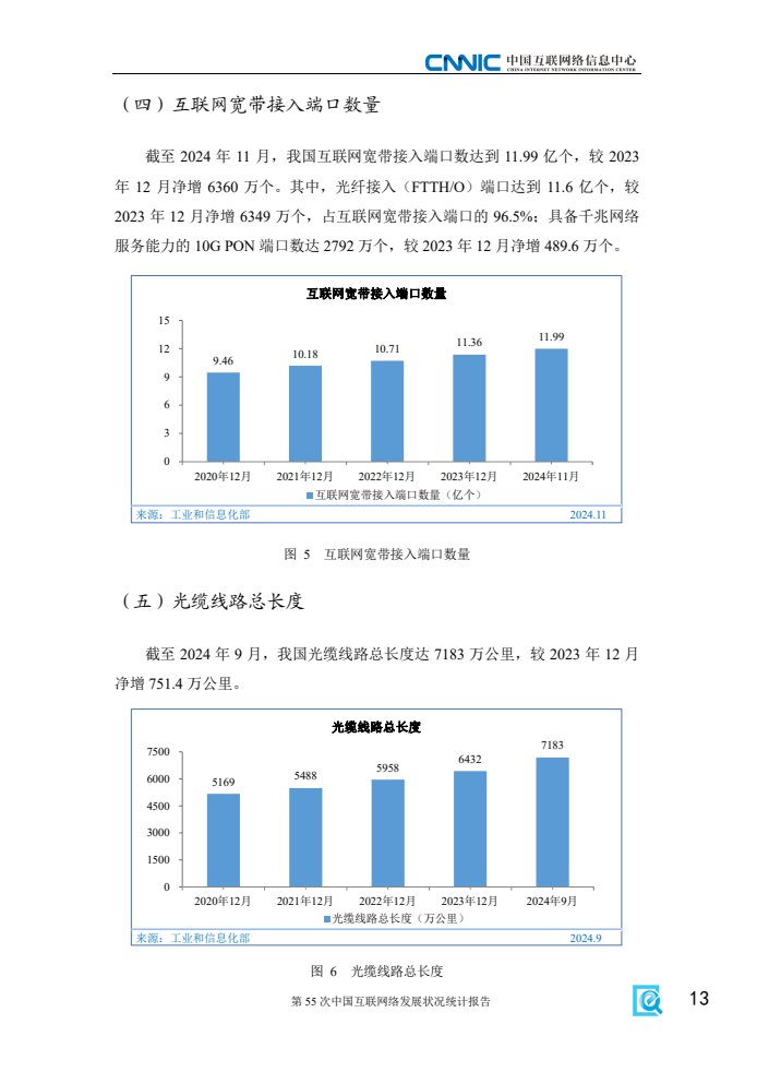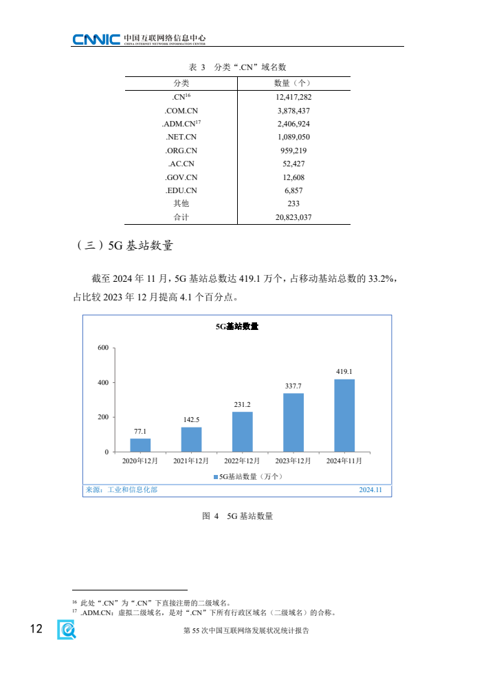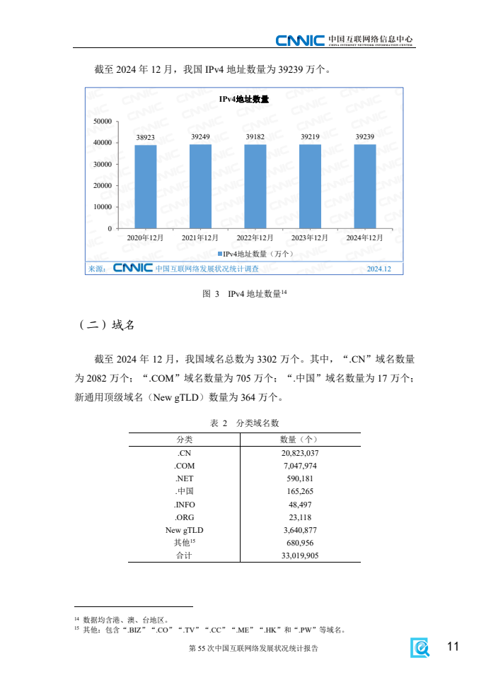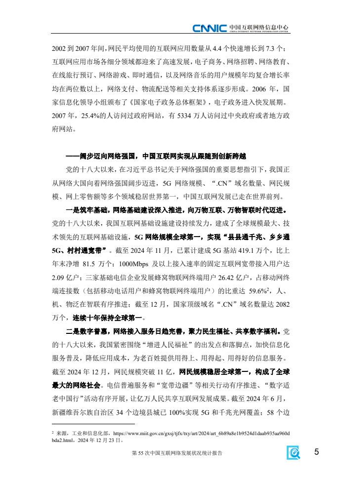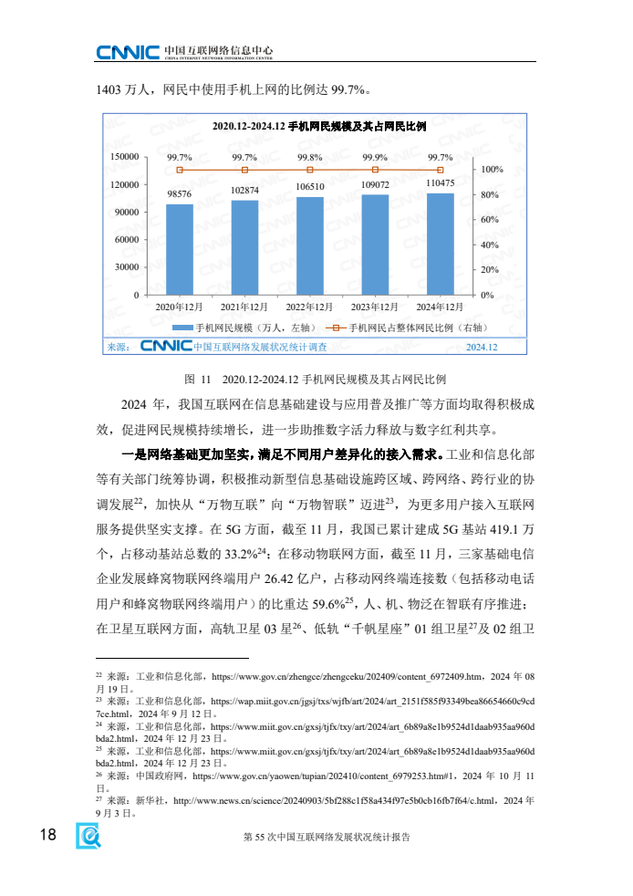 《报告》显示,2024年我国互联网基础资源持续发展,5G、千兆光纤宽带网络建设有序推进,移动互联网接入流量延续较快增势,信息通信业高质量发展成效显著。一是互联网基础资源持续丰富。截至12月,域名总数为3302万个,其中,国家顶级域名“.CN”数量为2082万个;IPv6地址数量为69148块/32,同比增长1.6%。二是新型信息基础设施协调发展。截至11月,已累计建成5G基站达419.1万个,比上年末净增81.5万个;3家基础电信企业发展蜂窝物联网终端用户26.42亿户,占移动网终端连接数的比重达59.6%,人、机、物泛在智联有序推进,为更多用户接入互联网服务提供坚实支撑。