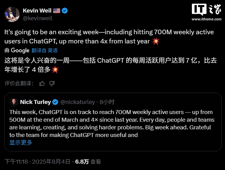 随后,OpenAI 首席产品官 Kevin Weil 进一步解释称,ChatGPT 周活跃用户比去年增长了 4 倍多。