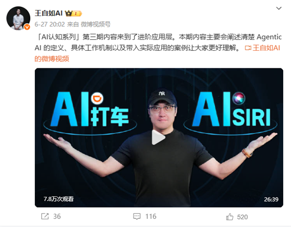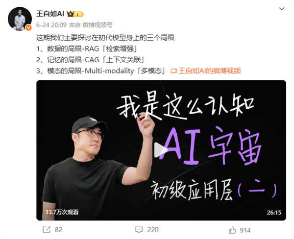 其中从6月中旬开始,王自如陆续发布了4期“AI认知小宇宙”系列视频,总时长超过100分钟。