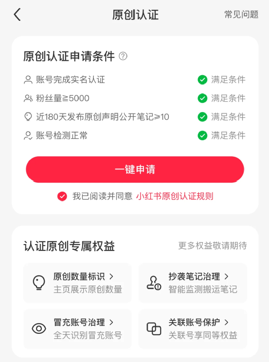 除此外,之前创作者需在过去30天发布至少1篇公开笔记、并在过去一年发布10篇笔记才能申请“原创认证”。如今,新的要求将修改为“在过去180天内,至少发布10篇公开笔记并声明原创”。为创作者提供更灵活的时间范围的同时,也有助于减少因发布时间不一致带来的困扰。