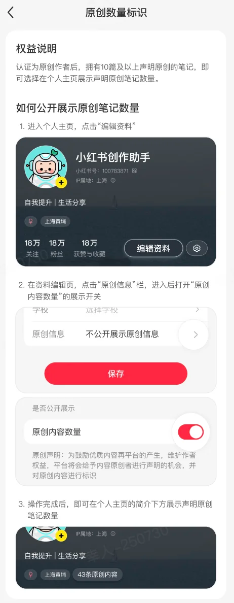 同时,平台鼓励创作者将原创声明笔记的数量展示在个人主页上。
