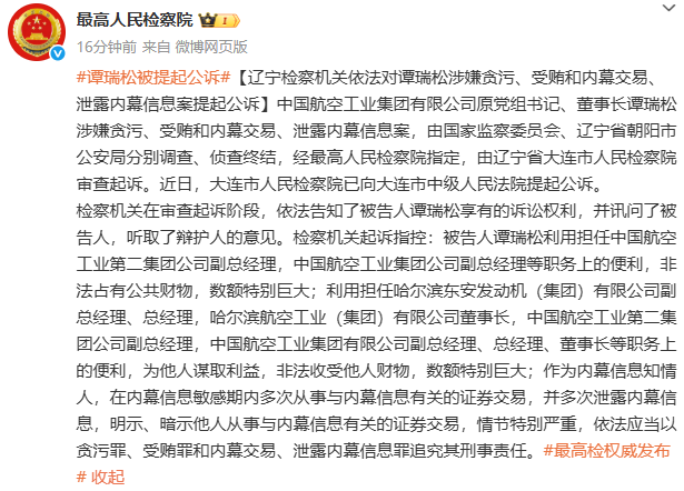 新京报讯 据最高检官博消息,中国航空工业集团有限公司原党组书记、董事长谭瑞松涉嫌贪污、受贿和内幕交易、泄露内幕信息案,由国家监察委员会、辽宁省朝阳市公安局分别调查、侦查终结,经最高人民检察院指定,由辽宁省大连市人民检察院审查起诉。近日,大连市人民检察院已向大连市中级人民法院提起公诉。