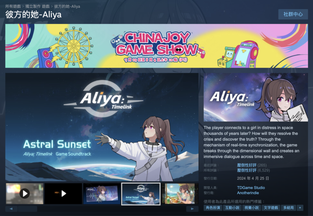 8 月 2 号,ChinaJoy 第二天,瞳电游工作室的制作人 Wuli 在 CGDC 发表了一场演讲,题目叫「拨动玩家情感的弦」。他说,做电子游戏就像在弹电吉他。而他们的游戏《彼方的她-Aliya》的确拨动了不少人的心。在 B 站二创视频能翻出 40 多页,在 Steam 上好评率高达 98%。