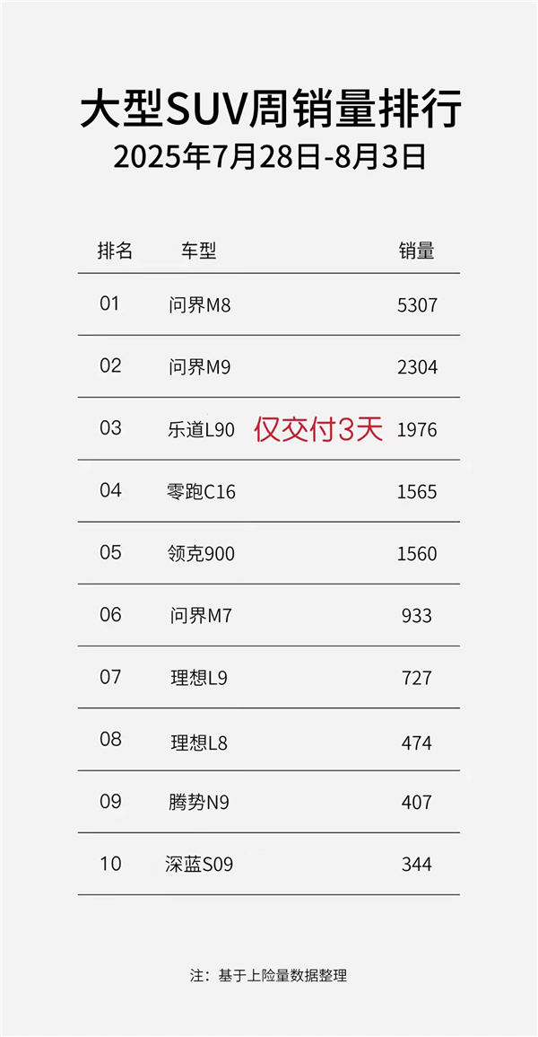 上周,蔚来汽车旗下乐道L90上市并开启交付,短短三天时间累计交付量达1976辆, 跻身大型SUV销量周榜top3,仅次于问界M9,相比理想L9/L8两款车型同期销量叠加还多775台。