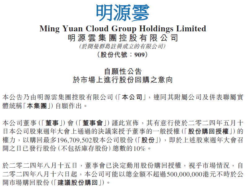 2024年8月,明源云曾公告于市场上进行股份回购之意向。公告显示,于2024年8月15日,董事会已决定动用股份购回授权,视乎市场情况,自2024年8月16日起,公司可能以总金额不超过5亿港元不时于公开市场购回股份。
