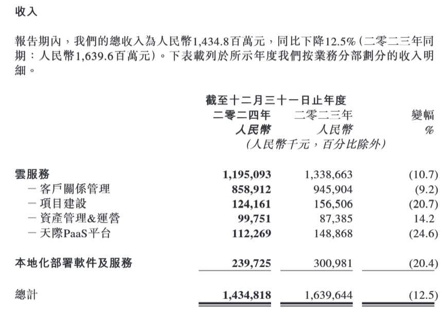 数据显示,2024年,明源云来自云服务的收入占总收入比例为83.3%。公司2024年来自云服务收入为11.95亿元,同比下降10.7%。
