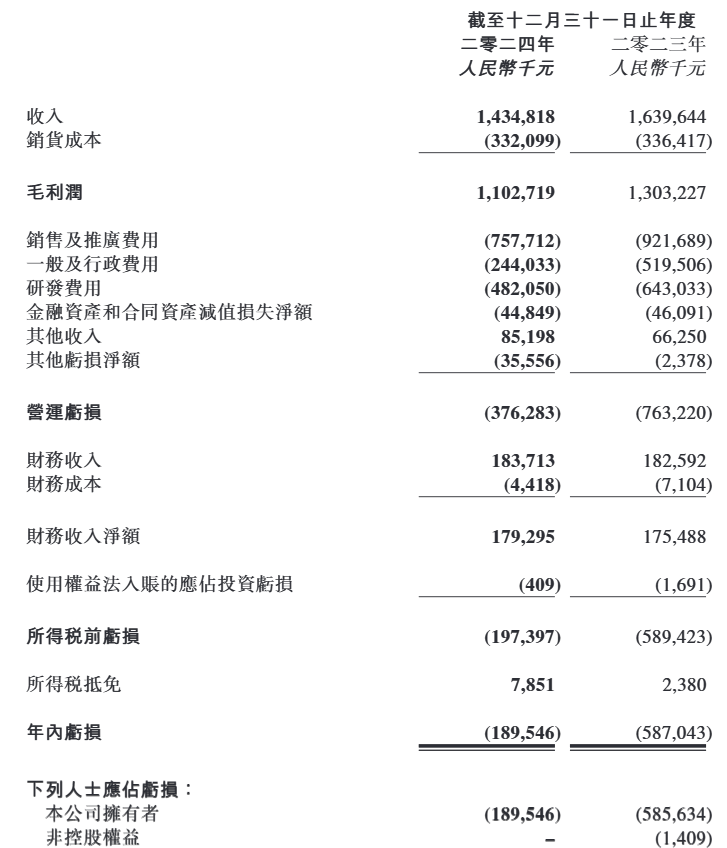 2024年,明源云年内亏损约1.9亿元,较上一年亏损5.87亿元减亏明显,主要是因为销售及推广费用、一般及行政费用、研发费用均明显下降。