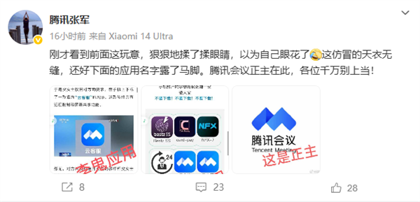 对此,腾讯公司公关总监张军发文回应:“刚才看到前面这玩意,狠狠地揉了揉眼睛,以为自己眼花了,这仿冒的天衣无缝,还好下面的应用名字露了马脚,腾讯会议正主在此,各位千万别上当。”
