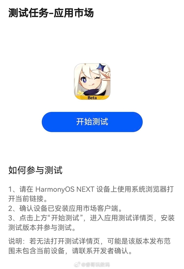 目前仅面向受邀用户开启推送,用户需要在收到邀测短信后点击测试链接跳转安装(必须是HarmonyOS NEXT设备)。