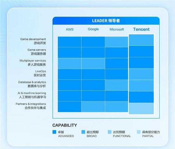 Omdia分析师评价称:“腾讯云在游戏服务器、多人游戏服务和人工智能与机器学习三项能力上获评最高等级(Advanced),并在游戏开发、实时运营以及数据库分析等能力上表现突出。”