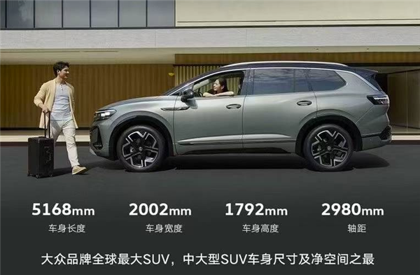 新款揽境长宽高分别为5168mm/2002mm/1792mm,轴距为2980mm,是大众品牌迄今尺寸最大的SUV。