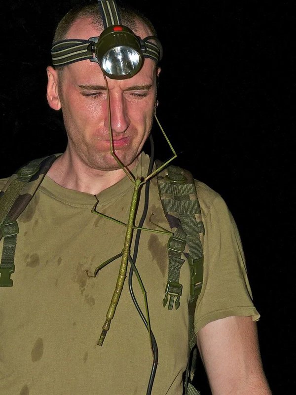 经过多个夜晚的搜寻,终于在海拔900米处发现了一只体型较大的雌性竹节虫,但由于它飞得太高,最后两人不得不借助一根长棍子才将其抓住。