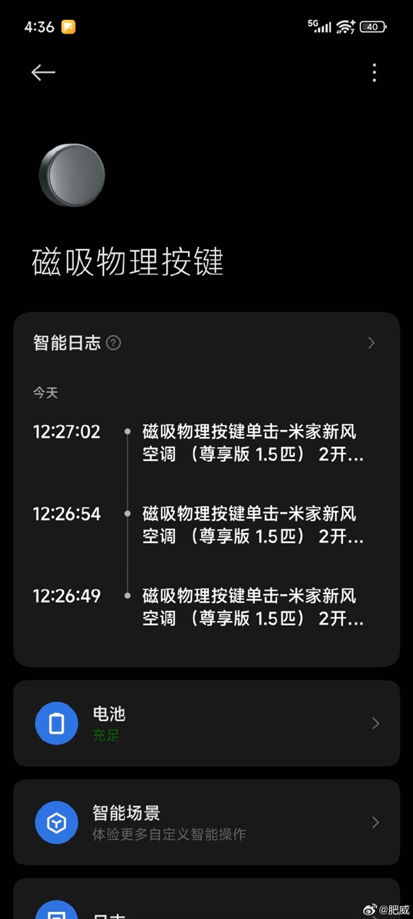 磁吸物理按键已接入米家,其可通过米家APP操控,并与其他产品互联互通。