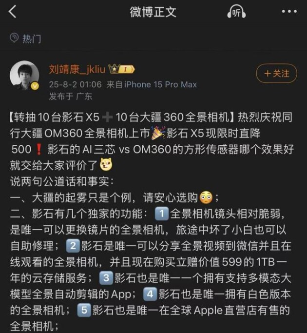 事件发展过程中,影石CEO刘靖康的营销行为引发关注。其在社交媒体转发用户投诉时,发布含“庆祝同行上市”文案的促销信息,并通过对比测试强调多品牌设备均存在起雾现象。尽管测试方法与大疆官方建议的操作高度相似,但此举仍被质疑存在利用热点事件进行商业炒作的嫌疑。