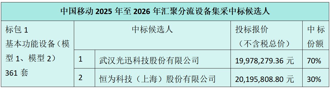 C114讯 8月6日消息(九九)中国移动采购与招标网日前发布 2025年至2026年汇聚分流设备集中采购项目中标候选人公示,标包1的中标候选人分别是武汉光迅科技股份有限公司和恒为科技(上海)股份有限公司。