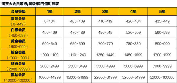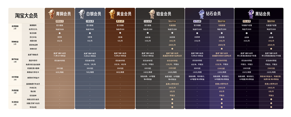 淘宝大会员体系覆盖所有用户,共分为6个等级:青铜会员、白银会员、黄金会员、铂金会员、钻石会员和黑钻会员。