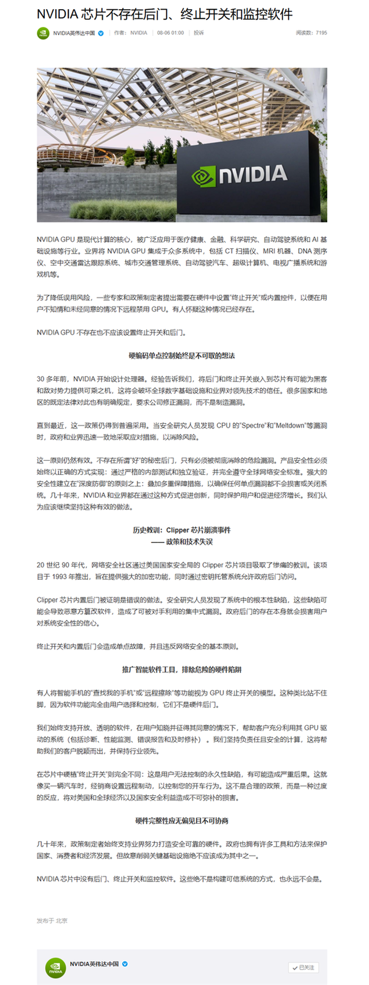 此次事件也引发了中国政府的关注。7月31日,国家互联网信息办公室约谈了英伟达,要求公司就其H20算力芯片可能存在的安全漏洞和后门问题作出说明,并提交相关材料。对此,英伟达再次强调,网络安全对公司至关重要,所有芯片都不存在后门,也不会让任何人通过远程手段控制或访问这些芯片。
