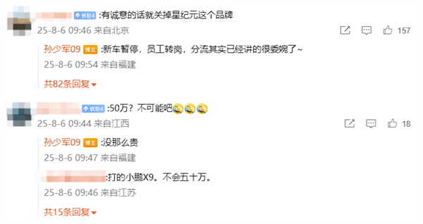 在评论区,有网友直言“有诚意的话就关掉星纪元这个品牌”,博主则回应称“新车暂停,员工转岗,分流其实已经讲的很委婉了”,个中意味大家可自行领悟。