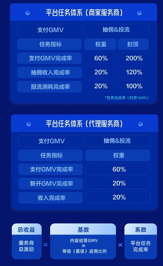 此外,平台推出了三大任务体系,分别是等级任务体系、平台任务体系和区域个性化任务体系。不同类型服务商有不同的任务要求。商家服务商重点考核支付GMV完成率、抽佣收入和投流消耗完成率等任务指标,其中支付GMV完成率权重最高达60%且封顶200%,总任务完成率最高可达164%。代理服务商考核将新开商家的交易额占比提高到20%,除此之外还考核支付GMV完成率(占60%)以及收入完成率(占20%)。