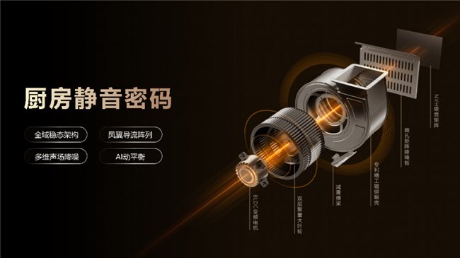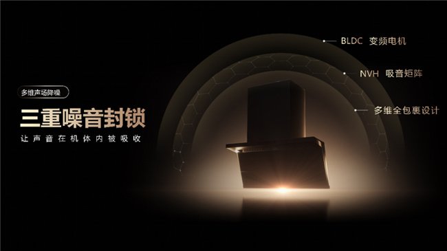 风眼引擎的全域稳态架构,搭载了行业领先的双层聚量大叶轮和超韧波纹消震架构,大幅降低了电机震动和风噪并且大大提升了机架的刚性和抗震能力。通过凤翼导流阵列优化风道设计,降低空气阻力,实现排风顺畅、噪音更小。值得一提的是,海信厨电应用了工艺更高的专利精工辊铆蜗壳,确保风眼U5降噪的同时提升排烟能力,实现静音与效能共赢。并通过采用BLDC变频电机+NVH吸音矩阵+多维全包裹设计的多维声场降噪的方式,对噪音传播路径进行了三重封锁,构建强大的静音屏障。