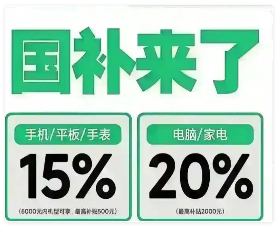 售价≤6000元的手机、平板、智能手表/手环,补贴15%,最高500元