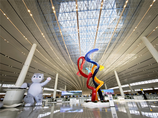 此外,出发厅东西两侧设置黑颈鹤、白唇鹿景观雕塑,中间设置雪豹气模区,到港通道墙面设置《唐蕃古道》《在那遥远的地方》5组艺术作品等。