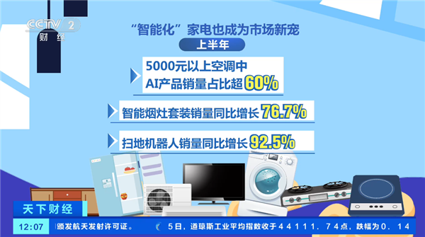 上半年,5000元以上空调中,AI产品销量占比超60%,智能烟灶套装、扫地机器人销量同比分别增长76.7%、92.5%。