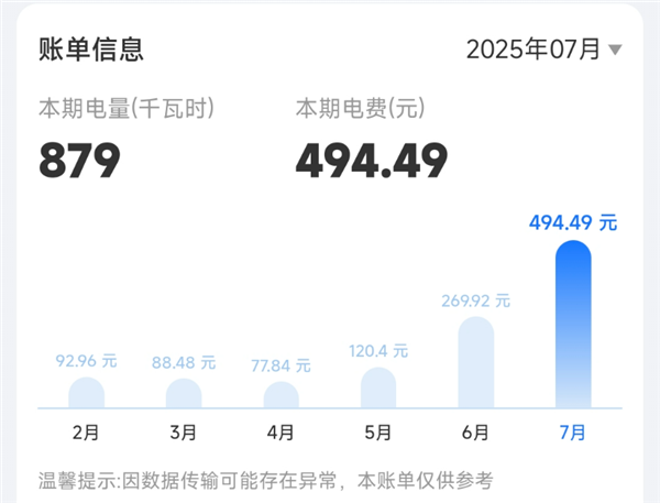 另外,多名网友反馈7月电费激增。据了解,夏季7、8月为集中用电高峰期间,极端高温天气下,空调等制冷设备长时间高负荷运行,叠加阶梯电价机制,使得部分家庭电费进入最高档位。