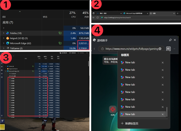 最后切到 Edge 游戏助手,发现它不知何时启动了 45 个新标签。(图 4)