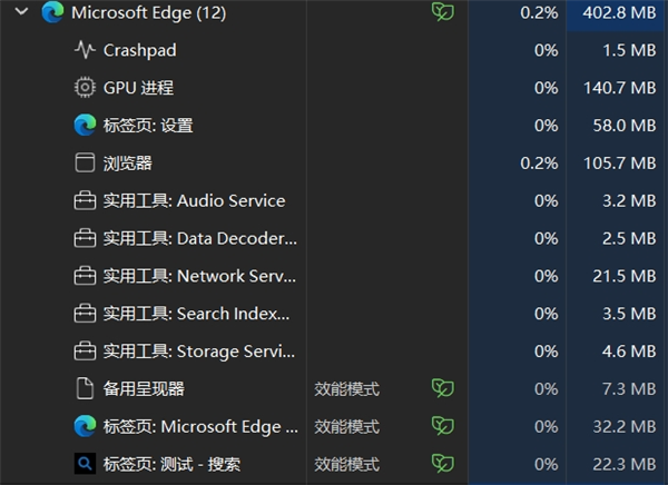 打开任务管理器详情,我发现 Edge 有 59 个子进程,其中有几十个“呈现器”,每个都占用 30、40 MB 内存(图 3)