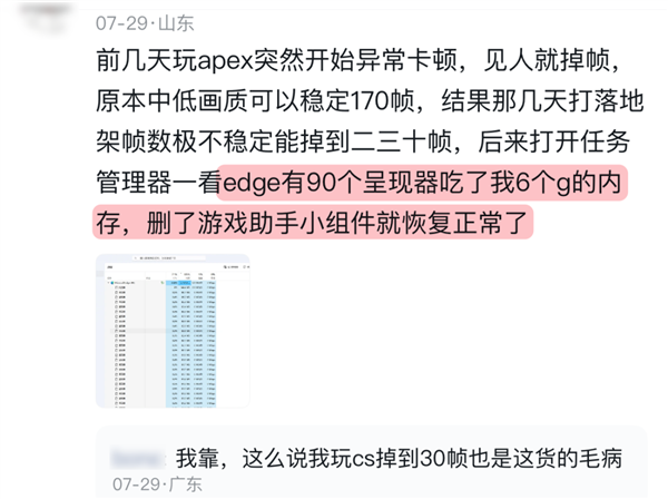 还有人本来好好的,突然有天开始 Apex 见人就掉帧。后来发现 Edge 吃了 6G 内存,删了游戏助手后一切恢复正常。