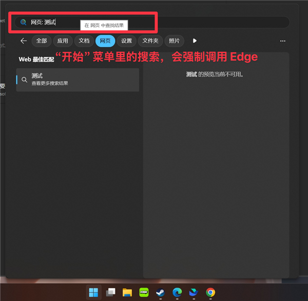 这意味着,一旦你从这些位置启动网页,电脑会强制用 Edge 浏览器打开,甚至搜索引擎也调用的是 Bing。