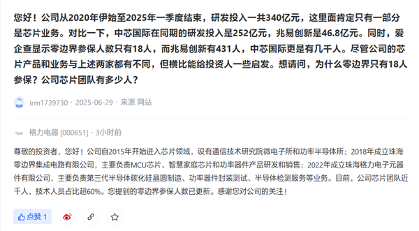 该投资者表示:公司从2020年伊始至2025年一季度结束,研发投入一共340亿元,这里面肯定只有一部分是芯片业务。对比一下,中芯国际在同期的研发投入是252亿元,兆易创新是46.8亿元。