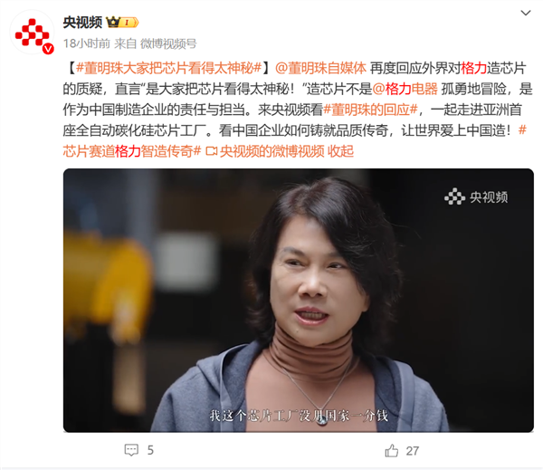 对于格力造芯片质疑,董明珠直言“是大家把芯片看得太神秘!”造芯片不是格力电器孤勇地冒险,是作为中国制造企业的责任与担当。