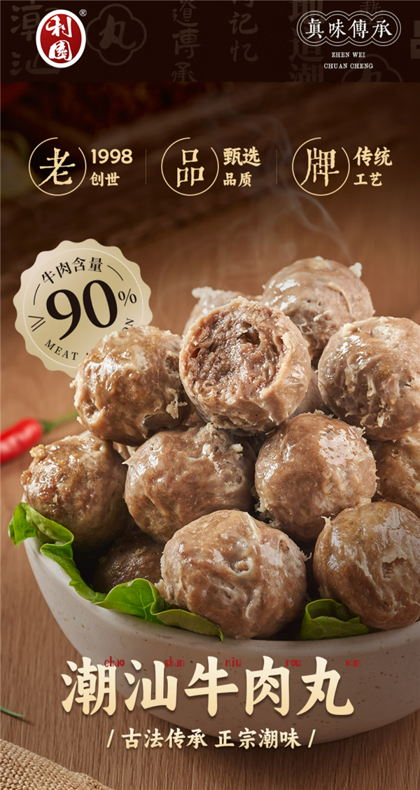 官方宣称是27年潮汕正宗老品牌,牛肉含量高达90%。