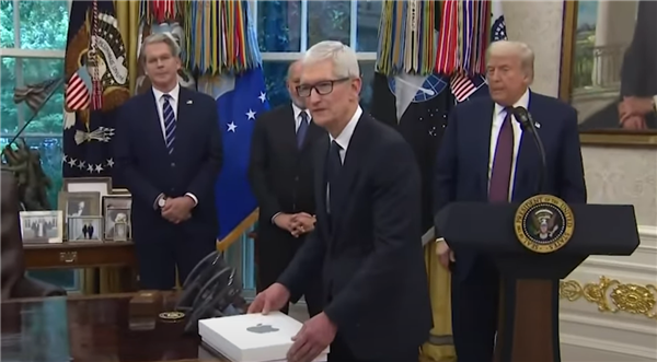 值得一提的是,库克还特别向特朗普赠送了一份礼物——刻有“美国制造”以及“总统特朗普”的24K黄金底座纪念玻璃,中间镂空了苹果标志。