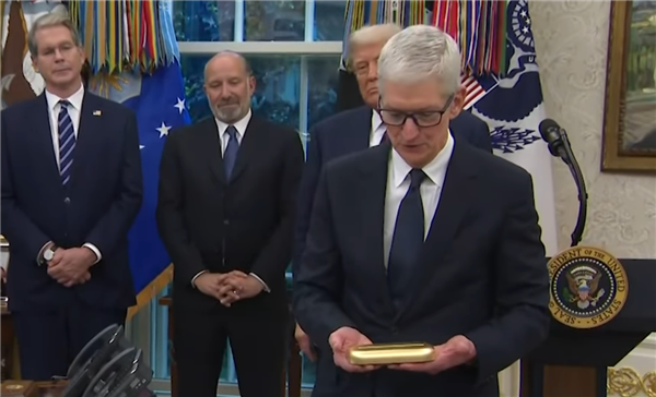 特朗普在副总统范斯、财政部长贝森特、商务部长卢特尼克和苹果CEO库克的陪同下,在白宫椭圆办公室举行记者会,宣布苹果将把今年2月承诺投资美国本土的金额,从5000亿美元增加到6000亿美元。