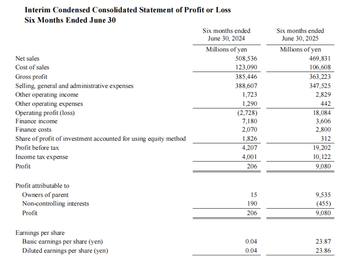 净销售额同比下降7.61%,“增效”似乎暂未起效,但“降本”已然看到成果:其中销售成本同比下降13.39%至1066.08亿日元;销售、一般及行政费用同比下降10.57%至3475.25亿日元。