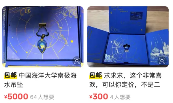 值得一提的是,这款南极海水吊坠已经出现在某二手平台上,有人标价5000元出售,也有人求购送女友。
