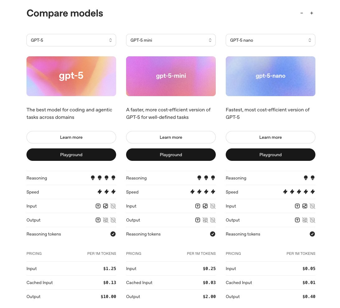 此外 Token 定价部分,标准版 GPT-5 为每百万输入 Token 1.25 美元,每百万输出 Token 10 美元。mini 版 与 Nano 版定价都便宜不少。