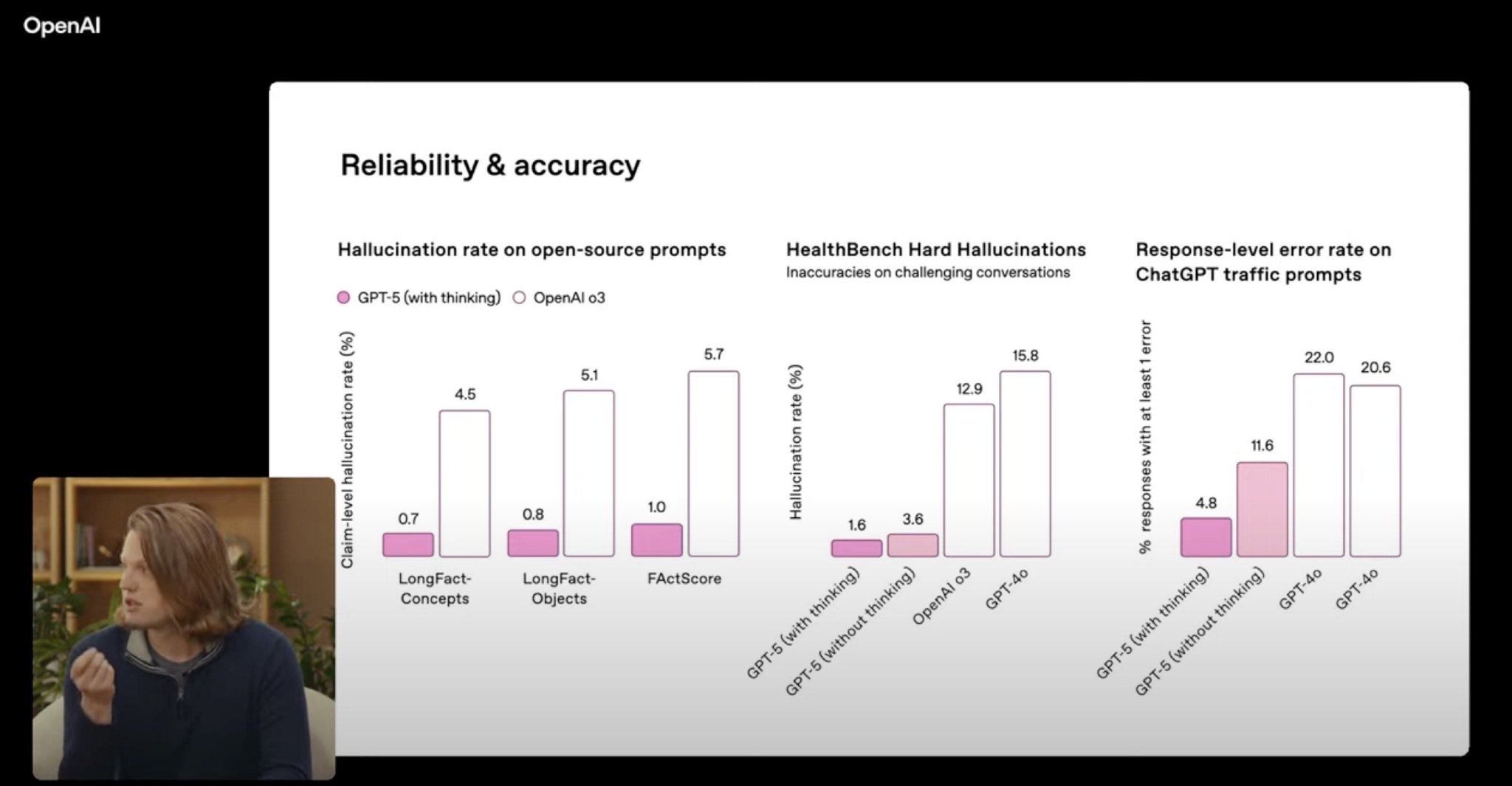 在联网搜索时,GPT-5 的回答出现事实错误的概率比 GPT-4o 低了 45%。