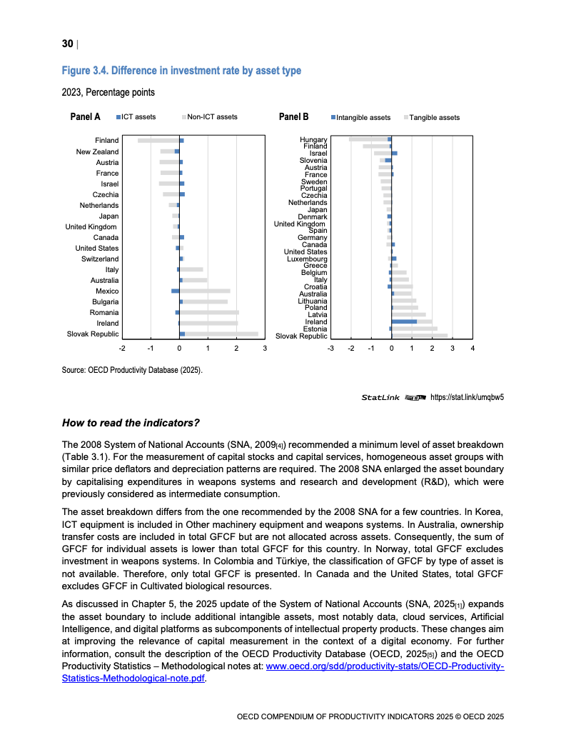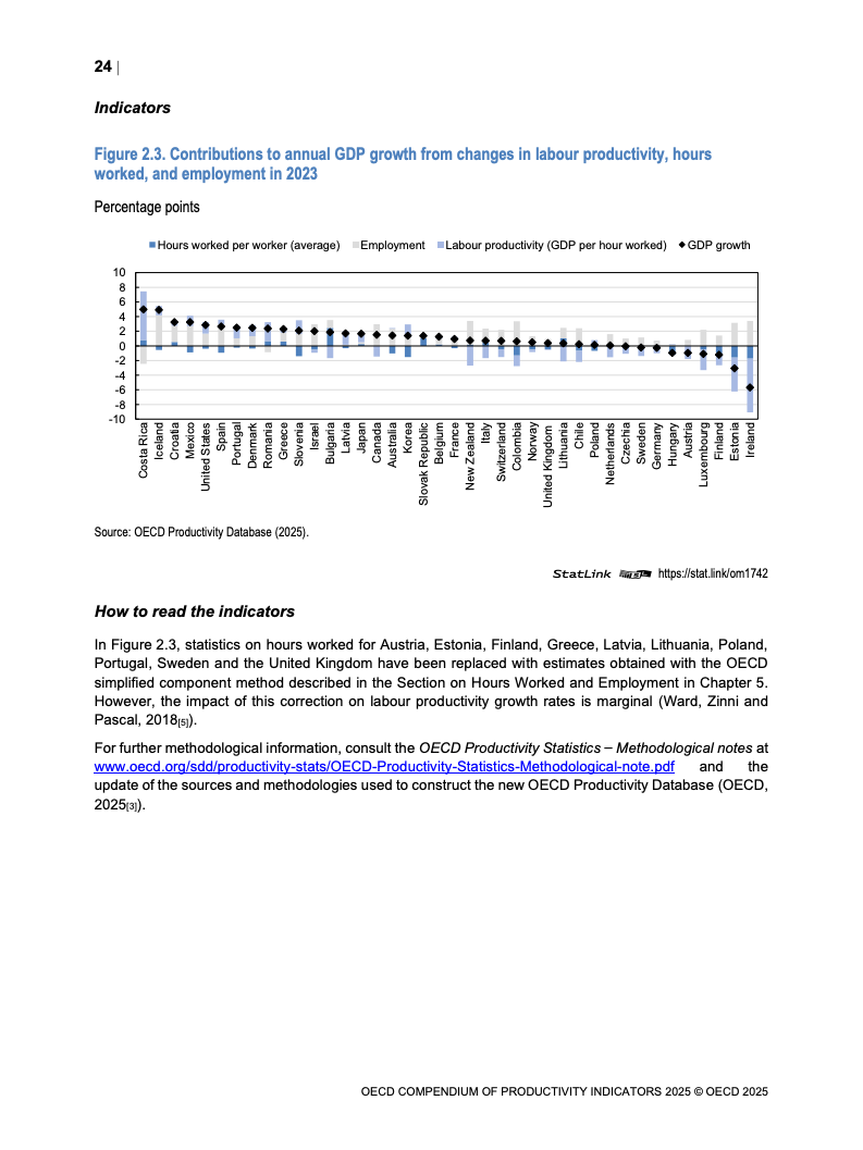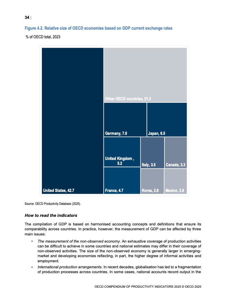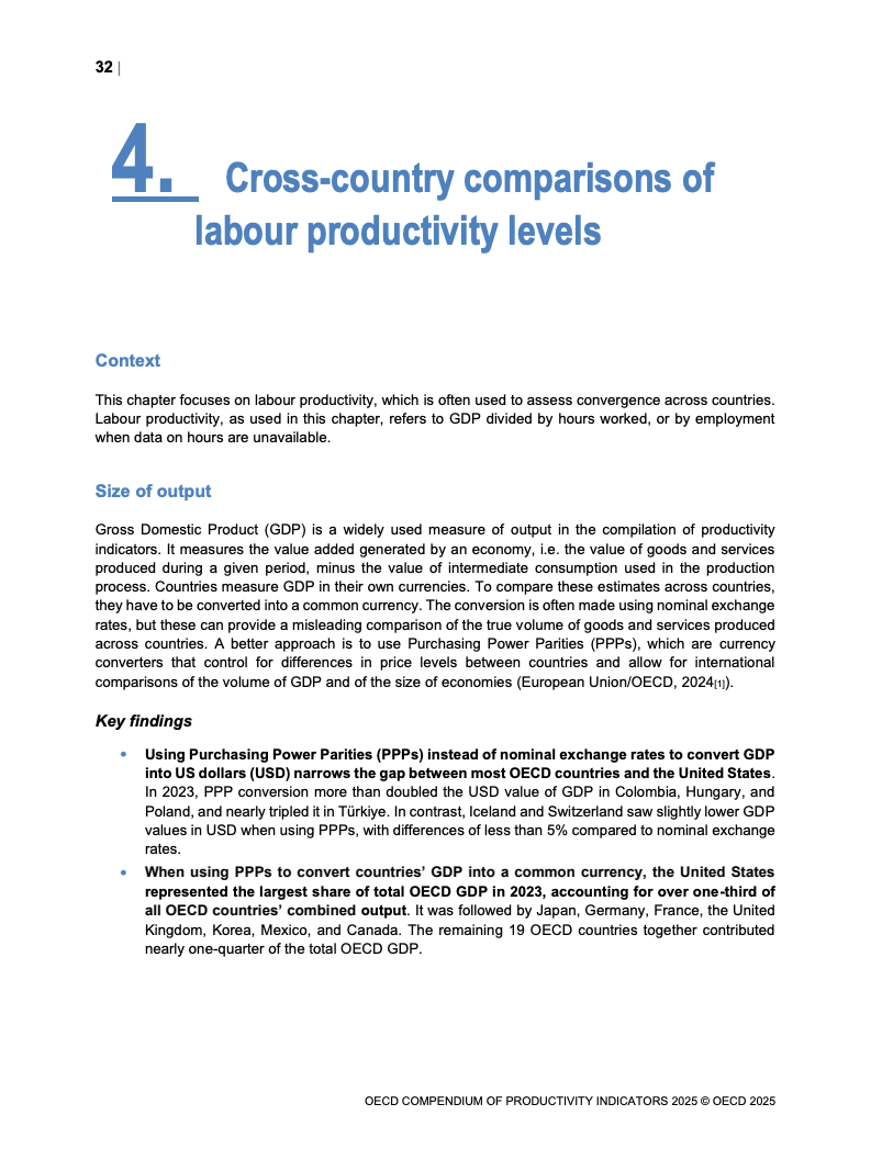 从跨国比较视角看,经购买力平价(PPP)调整后,美国占OECD总GDP的34%。尽管自2000年以来成员国生产率水平存在趋同趋势,但国别差异依然悬殊,最高与最低水平国家相差近六倍。这些差异更多由营商环境、监管框架等长期结构性因素决定,而非短期经济周期波动。