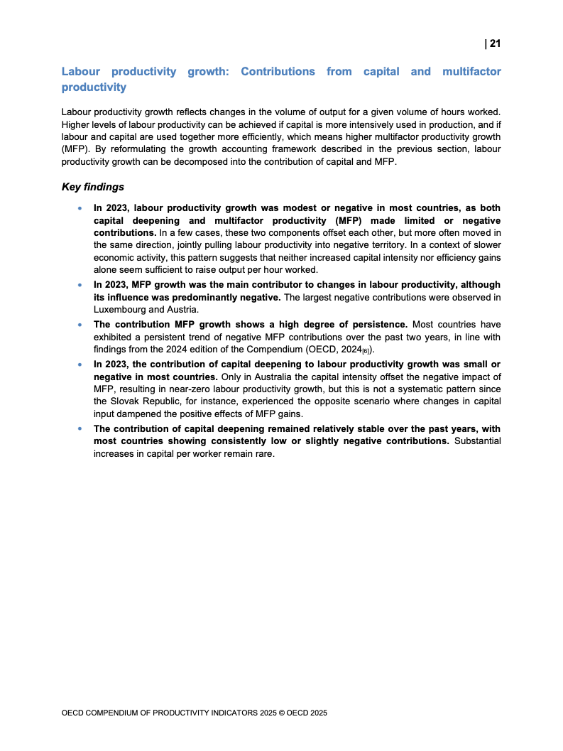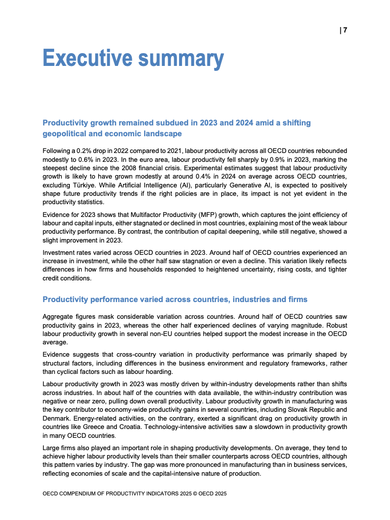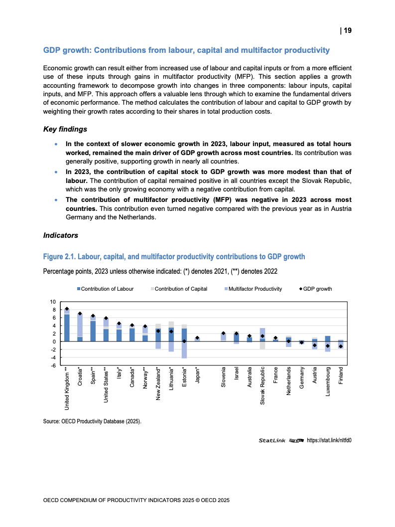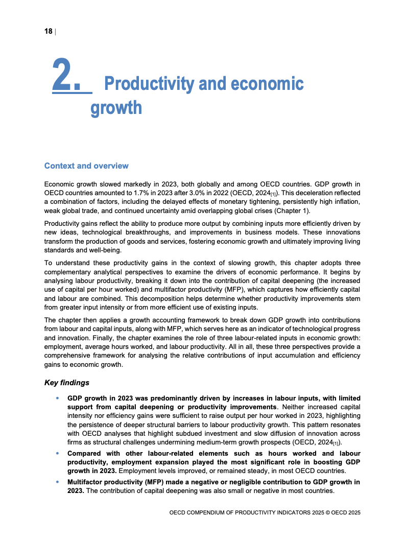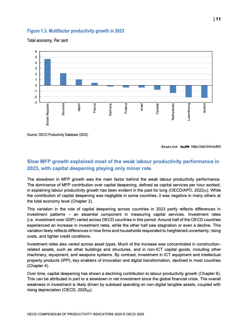 全球生产力增长呈现低迷态势。2023年OECD经济体劳动生产率平均仅增长0.6%,而欧元区则录得负0.9%的显著下滑,为2009年金融危机以来的最差表现。增长动力主要源于劳动投入量的增加,而非效率提升。多要素生产率(MFP)的停滞乃至负增长,以及资本深化贡献的微弱,是导致这一疲软局面的核心驱动因素。